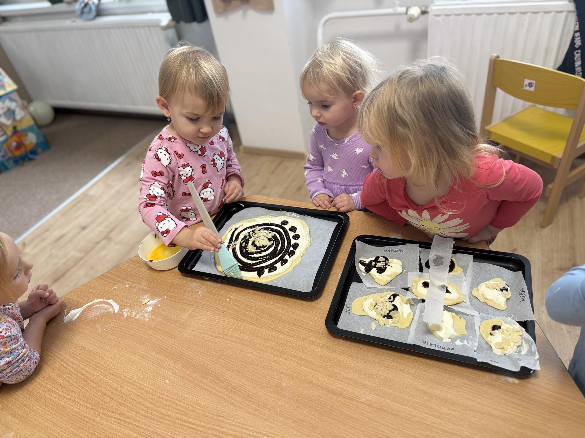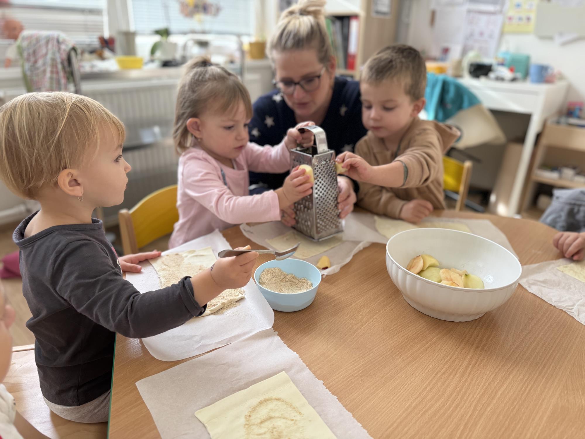 Letošní rok byl požehnaný na ovoce, a tak jsme se pustili i do moštování. Děti si rozdělily úkoly jako správná výrobní linka – mytí, krájení, strouhání, lisování… a samozřejmě ochutnávání. Šťáva mizela rychleji, než stihla kapat z lisu. A jablka, která zbyla, se proměnila v jablečné štrůdly, jejichž vůně se linula celou budovou. Některé štrůdly domů ani nedošly – prý se „ztratily po cestě v bříšku“.