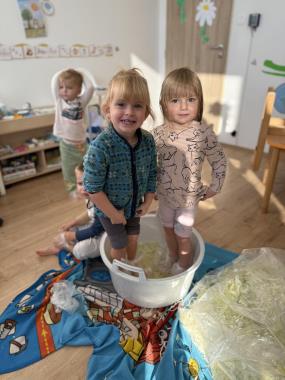 Další aktivitou bylo Zelnobraní! Krouhárna Roudné nám věnovala krouhané zelí, které děti ochutnávaly, našlapávaly a nakládaly do velkého hrnce. Teď krásně kvasí a děti si chodí k zelnému hrnci pravidelně přivonět. Většinu zelí si rodiny odnesou domů a ze zbytku upečeme tradiční zelňáky. Pro mnoho dětí je to jedinečný zážitek, který dnes už v mnoha domácnostech nenajdeme – o to víc si ho vážíme.