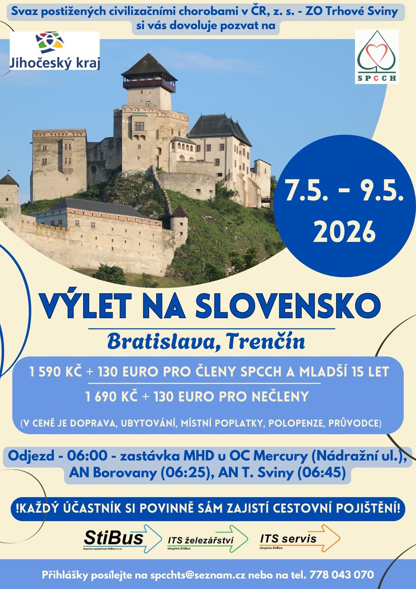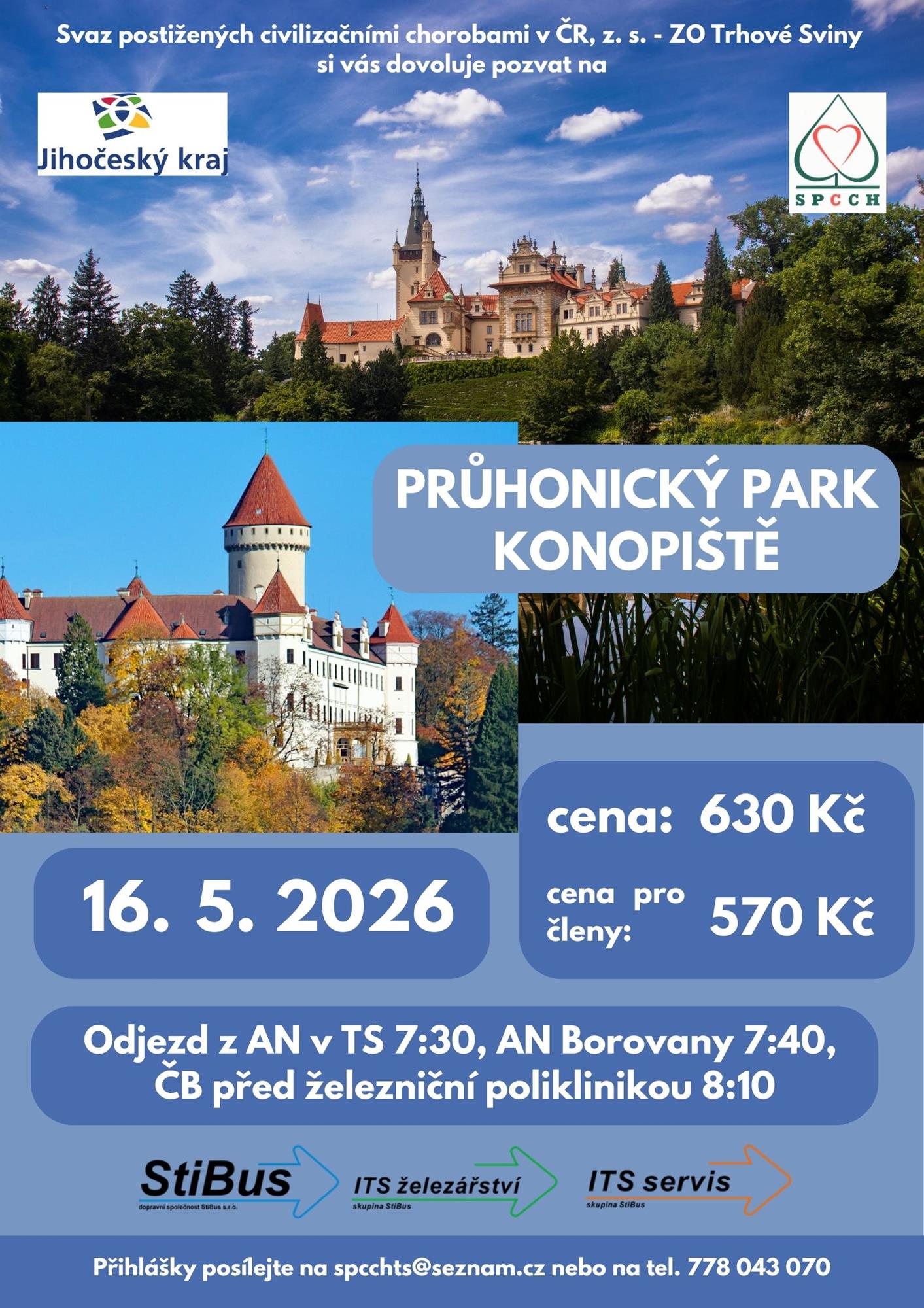 Vedle zájezdu do Bratislavy a do Trenčína (7. - 9. 5.), kde zbývají 4 volná místa, pojedeme 16. května v květnu ještě do Průhonického parku a na zámek Konopiště (16. 5.) kapacitně už je naplněno, přijímáme záznamy už pouze na místa náhradníků.