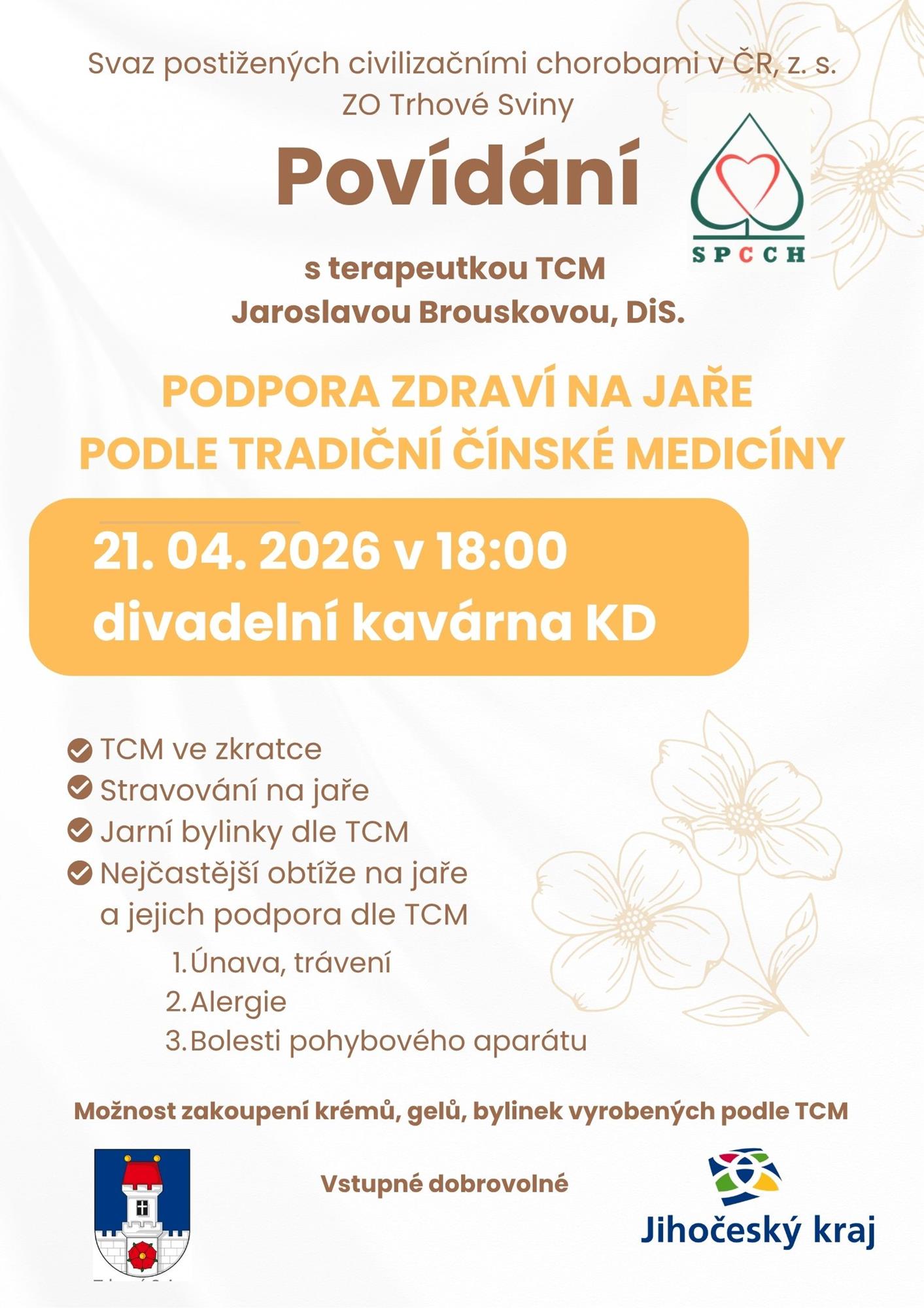 O tom, jak pomoci svému zdraví se můžeme leccos dozvědět v úterý 21. dubna, kdy od 18:00 za námi do divadelní kavárny KD přijde paní Jaroslava Brousková, DiS, aby se s námi podělila o své zkušenosti z využívání poznatků tradiční čínské medicíny v jarním období.