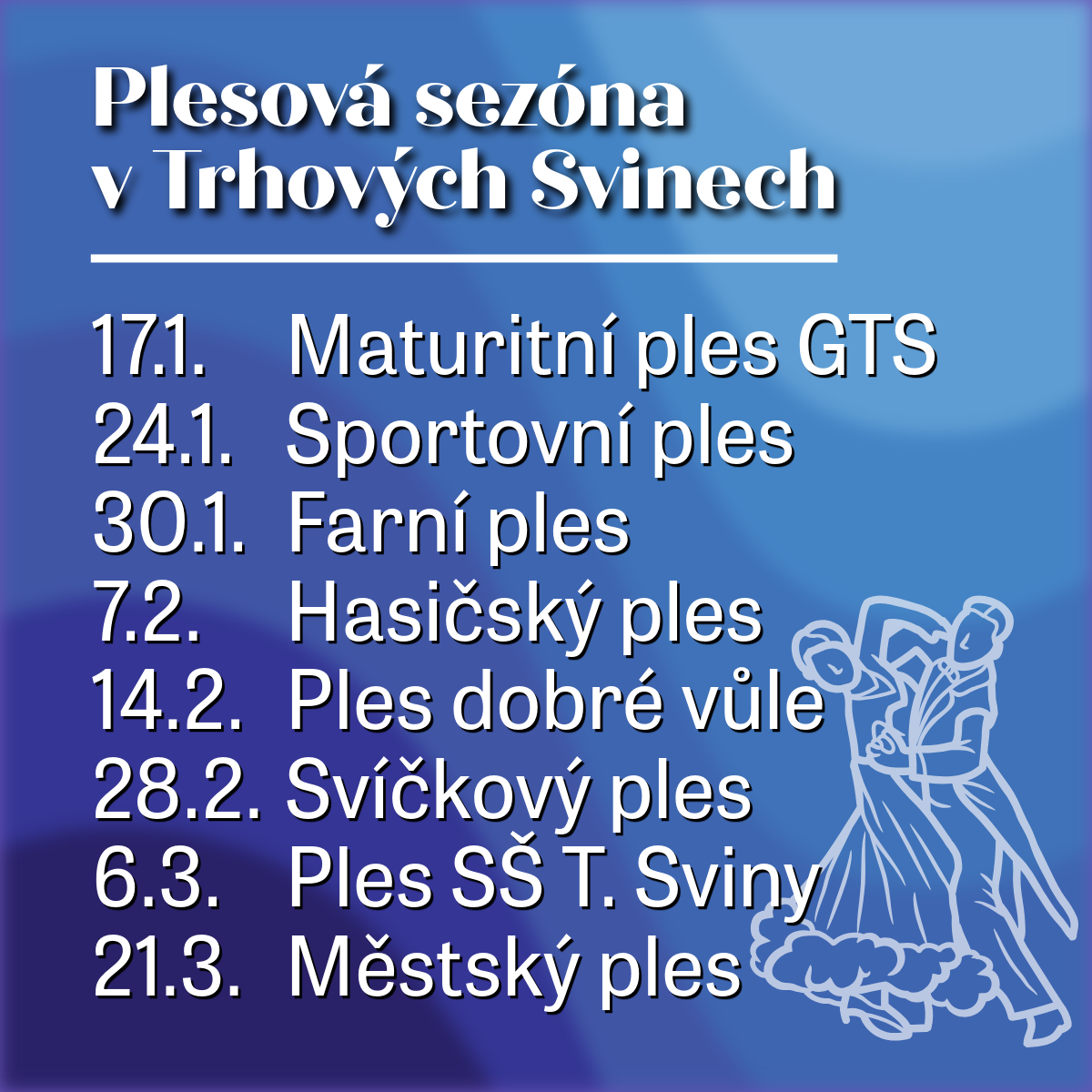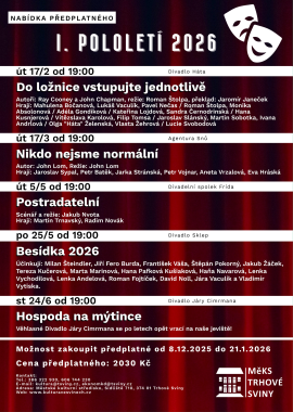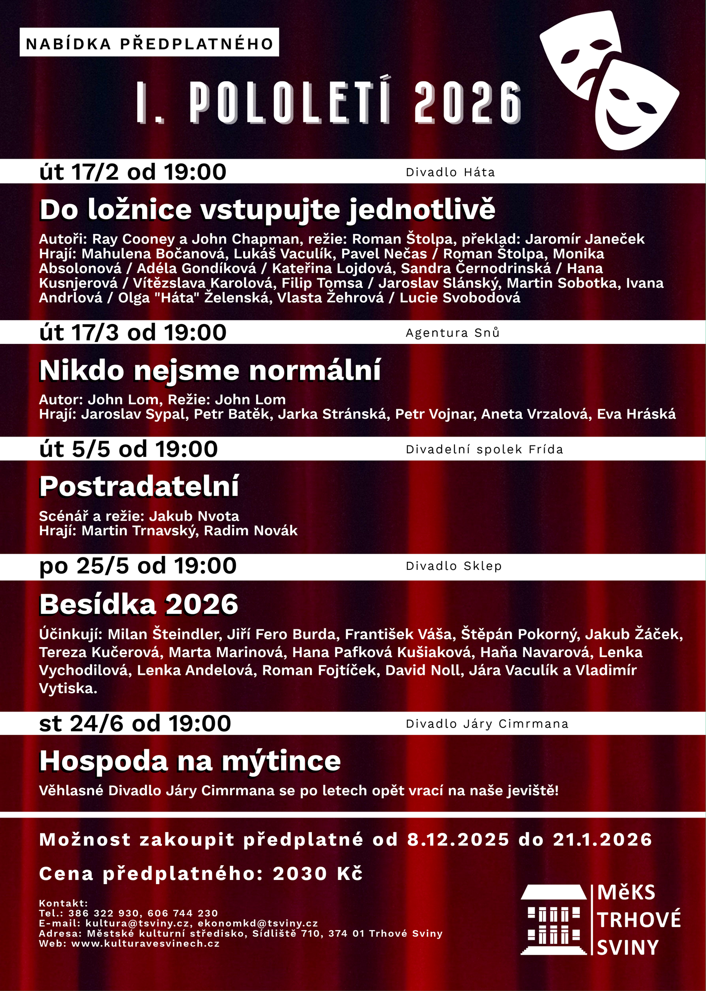 Připravili jsme pro vás předplatné kulturních pořadů na I. pololetí 2026. Těšit se můžete na: 17. 2. Divadlo Háta – Do ložnice vstupujte jednotlivě, 17. 3. Agentura Snů – Nikdo nejsme normální, 5. 5. Divadelní spolek Frída - Postradatelní, 25. 5. Divadlo Sklep - Besídka 2026 a 24. 6. Divadlo Járy Cimrmana - Hospoda na mýtince. Cena předplatného všech 5 kulturních pořadů je 2 030 Kč. Zájemci o předplatné se mohou přihlásit osobně v kanceláři KD Trhové Sviny nebo e-mailem (ekonomkd@tsviny.cz nebo kultura@tsviny.cz) do 21. 1. 2026 (od 26. 1. 2026 bude možné zakoupit vstupenky na jednotlivá představení).