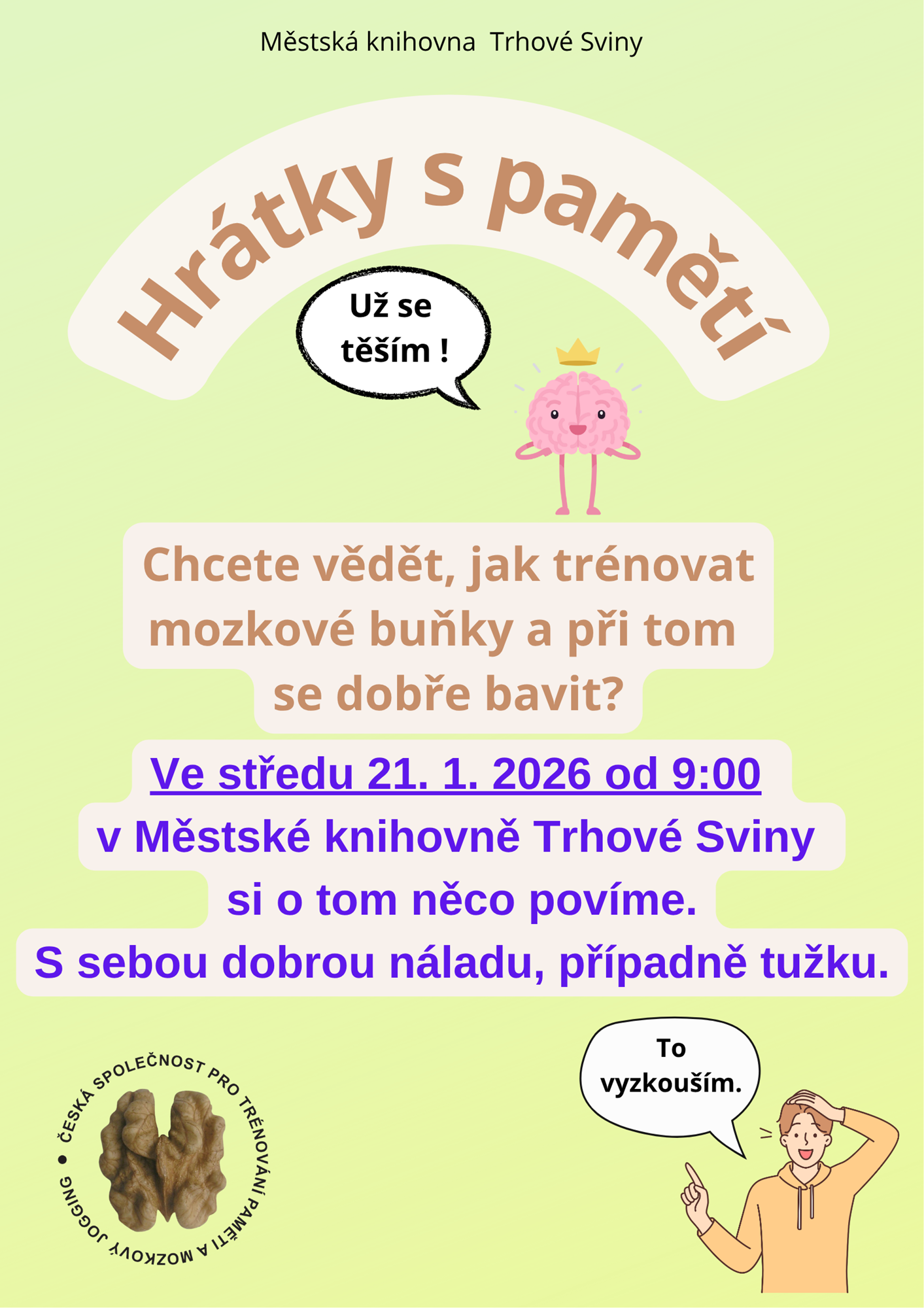 Ve středu 21. ledna od 9 hodin Vás zveme na Hrátky s pamětí. Chcete vědět, jak trénovat mozkové buňky a při tom se dobře bavit? Přijďte do knihovny v T. Svinech, s sebou dobrou náladu a tužku. Vstupné je zdarma.