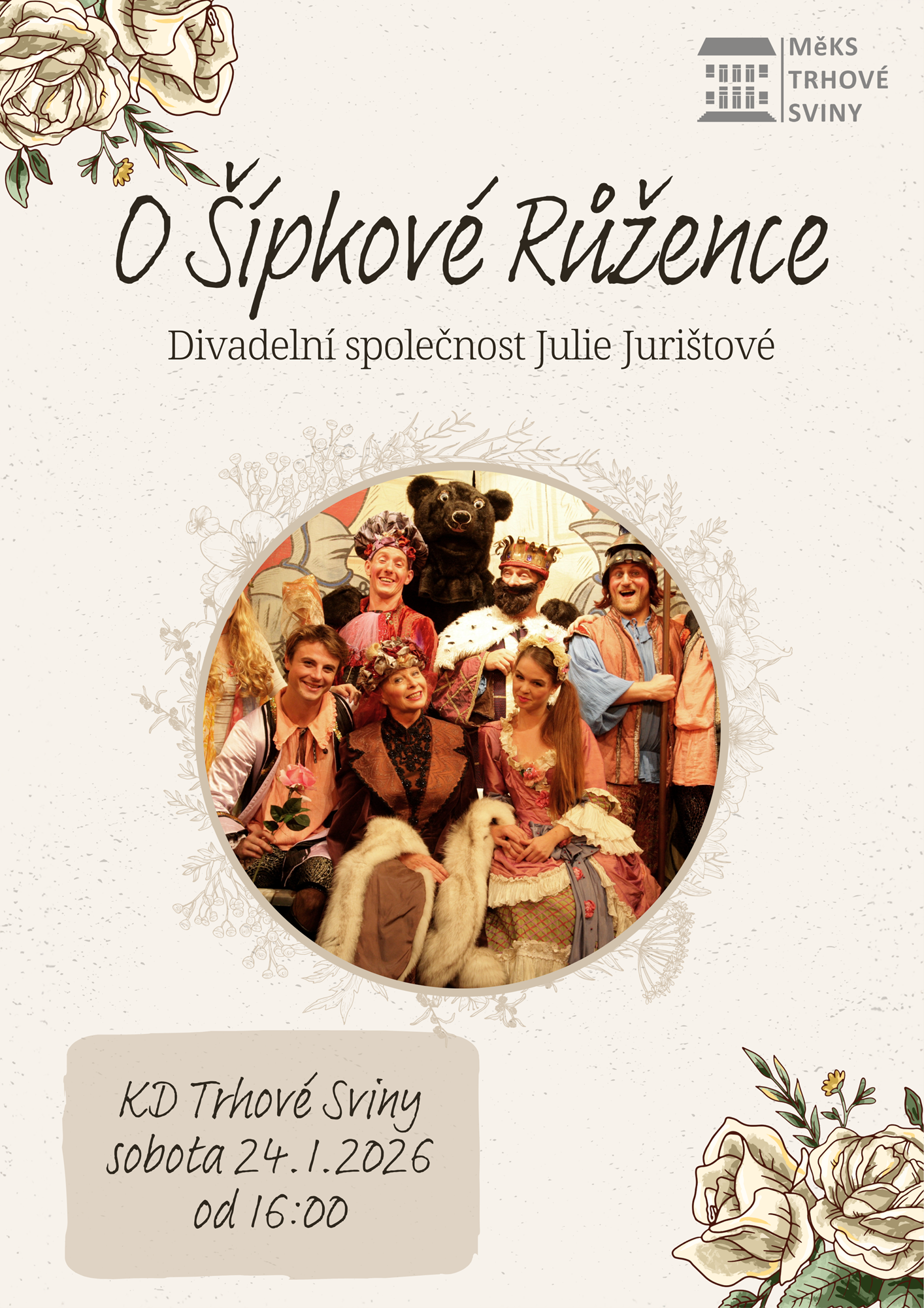 V sobotu 24. ledna od 16 hodin v divadelním sále KD T. Sviny uvede Divadelní společnost Julie Jurištové divadelní inscenaci O Šípkové Růžence na motivy klasické pohádky bratří Grimmů. V jedné zemi se v království krále Ctirada narodí princezna Růženka. Přizvané sudičky dají Růžence do vínku moudrost, krásu a štěstí. Ale sudička, která nebyla pozvána, vyřkne nad Růženkou zlou kletbu. Podaří se princi Janovi a jeho sluhovi Jakubovi zrušit neblahou věštbu a princeznu Růženku od kletby osvobodit? Hrají: Julie Jurištová, Veronika Baldrianová, Libor Jeník / Jiří Krejčí, Michal Dadura / Lukáš Borik. Vstupné 100 Kč.