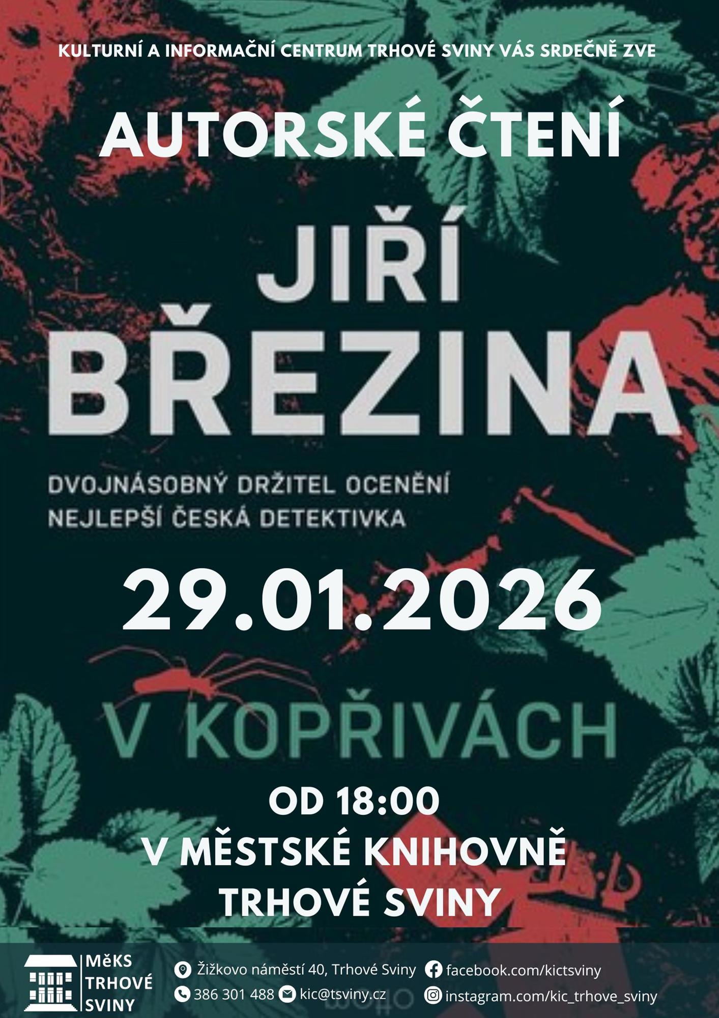 Ve čtvrtek 29. ledna od 18 hodin vás zveme do knihovny Trhové Sviny na autorské čtení s Jiřím Březinou. Autor představí svou novou knihu "V kopřivách"- Jana tuší, že muž, se kterým čeká dítě, něco skrývá. Musí odhalit pravdu. Radka zjišťuje, že její syn provedl něco, co nejde vzít zpět. Musí ho ochránit před následky. A v kopřivách leží dívčí tělo. Rozjíždí se vyšetřování, které odhalí roky zamlčovaná fakta. Minulost se dere na povrch a s ní i otázky, které bolí: Jak dobře známe své nejbližší? A kam až jsme nakonec schopní zajít, abychom je ochránili? Vstupné je zdarma.