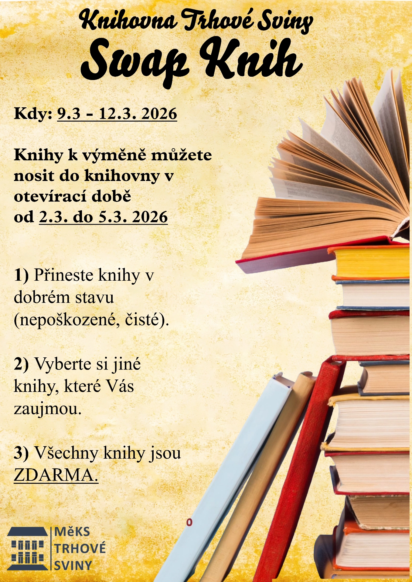 Na březen 2026 jsme pro vás v knihovně v T. Svinech připravili akci s názvem SWAP KNIH -Vyměňujte, objevujte a sdílejte knihy. Přijďte si k nám do knihovny vyměnit knihy v dobrém stavu (čisté, nepoškozené), které už máte přečtené, znáte je nazpaměť, nebo ty, které jsou ve vaší domácí knihovně už příliš dlouho - romány, detektivky, kuchařky, dětské knihy i pohádky - a vyměňte si je za jiné knihy. Knihy k výměně přijímáme od 2. 3. do 5. 3. v otevírací době knihovny (PO 8-11/12-18h, ST 12-16h, ČT 8-11/12-18h). Ve dnech 9. 3. - 12. 3. si pak budete moci zcela zdarma vybrat knihy jiné, které vás zaujmou.
