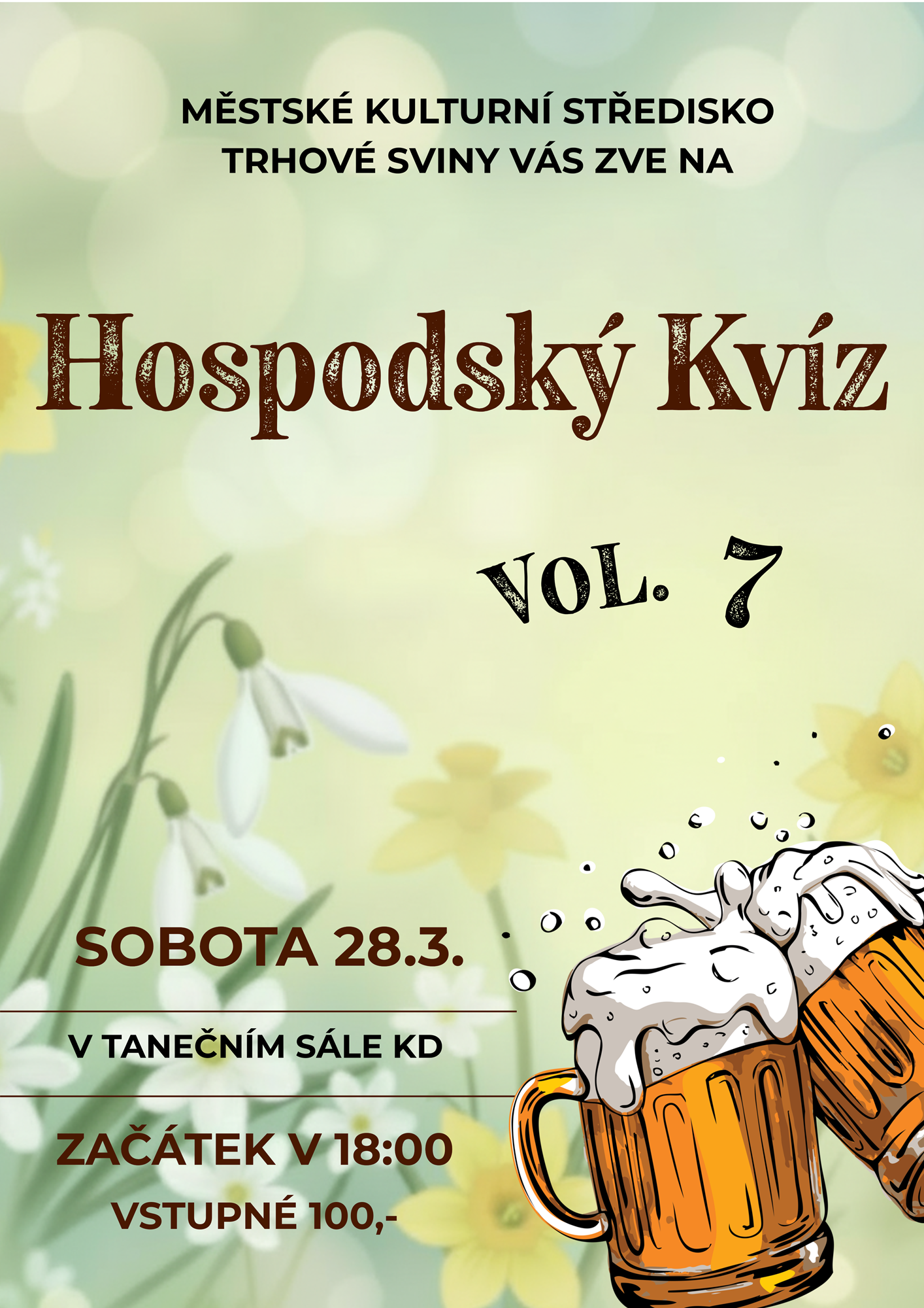 V sobotu 28. března od 18 hodin si přijďte do tanečního sálu KD T. Sviny provětrat mozkové závity a užít si večer plný zábavy na Hospodském kvízu vol.7. Čekají na vás zajímavé vědomostní otázky z různých oborů, skvělá atmosféra a ceny pro nejlepší týmy. Registrovat se můžete na www.kulturavesvinech.cz. Vstupné 100 Kč.