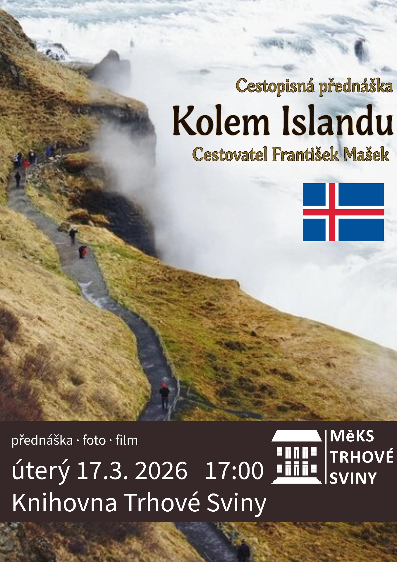 V úterý 17. března od 17 hodin se v knihovně v T. Svinech koná cestovatelská přednáška „Putování po Islandu“ očima zkušeného cestovatele Františka Maška. Vstupné dobrovolné.