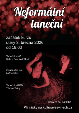 Od úterý 3. března od 19 hodin pořádáme v tanečním sále KD T. Sviny Neformální taneční. Máte chuť se naučit tančit, ale tradiční taneční nejsou nic pro vás? 9 lekcí, kde se naučíte základní kroky v pohodové atmosféře, bez obleků a večerních rób. Lektoři: manželé Košťálovi. Živá kapela. Jako bonus prodloužená lekce na závěr kurzu. Přihlásit se můžete v kanceláři MěKS T. Sviny nebo online na www.kulturavesvinech.cz. Kurzovné: 3 400 Kč/pár.