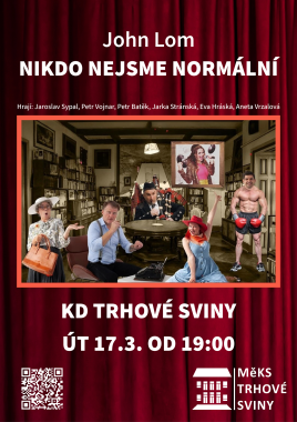 V úterý 17. března od 19 hodin bychom vás chtěli pozvat do KD T. Sviny na představení Nikdo nejsme normální. Komediální hit, vodopád neuvěřitelných situací, kterým se divácká bránice jen těžko ubrání. Roger, Belinda, Frenky, Carmen, Dustin a Gloria jsou zárukami skvěle prožitého večera. A jako třešnička na dortu zástupce umělé inteligence Kliford. Hrají: J. Sypal, P. Batěk, J. Stránská, A. Vrzalová, E. Hráská, P. Vojnar. Vstupné 380 Kč/350 Kč.