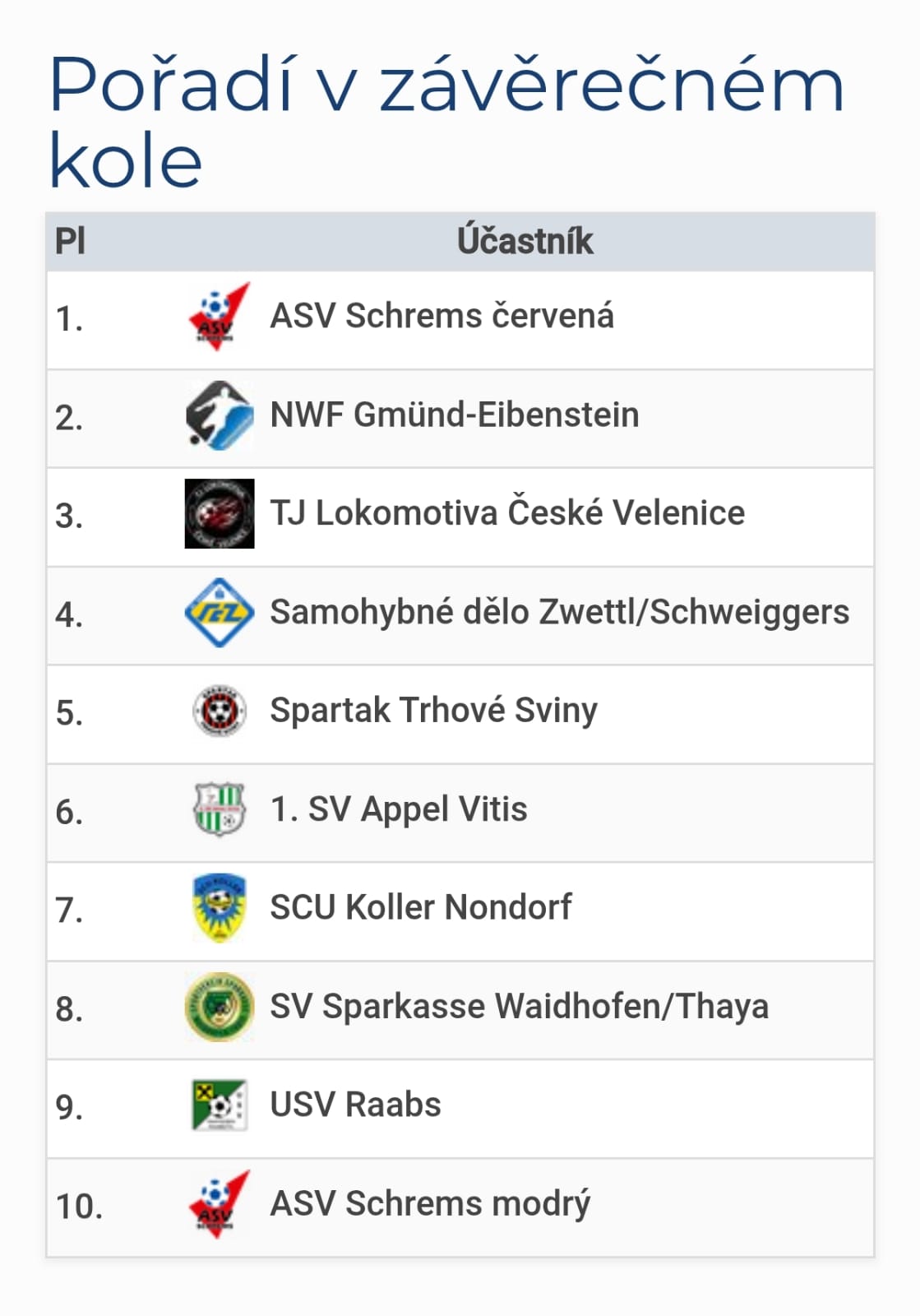 Turnaj se hrál ve dvou základních skupinách, kde naši kluci potkali pořádající ASC Schrems modrý tým (domácí měli nasazena dvě mužstva), dále SPG Zwettl/Schweiggers, SCU Koller Nondorf a USV Raabs. Ve druhé skupině pak startovali již zmíněné České Velenice, NWF Gmüng/Eibenstein, 1. SV Appel Vitis, SV Sparkasse Waidhofen/Thaya a ASV Schrems modrý tým.