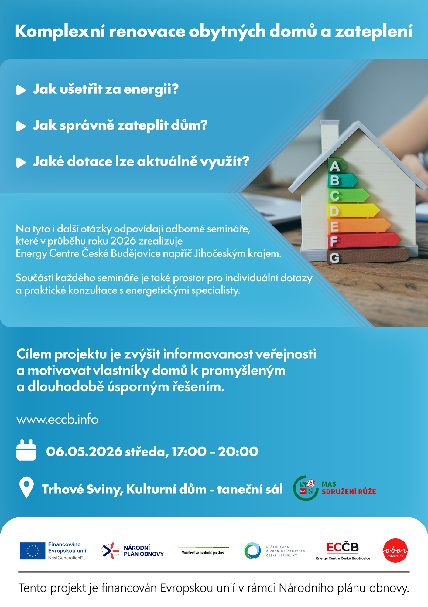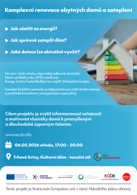 Semináře probíhají v průběhu roku 2026 ve vybraných obcích Jihočeského kraje v rámci projektu energetické osvěty. Projekt realizuje Energy Centre České Budějovice a je financován Evropskou unií z Národního plánu obnovy.