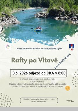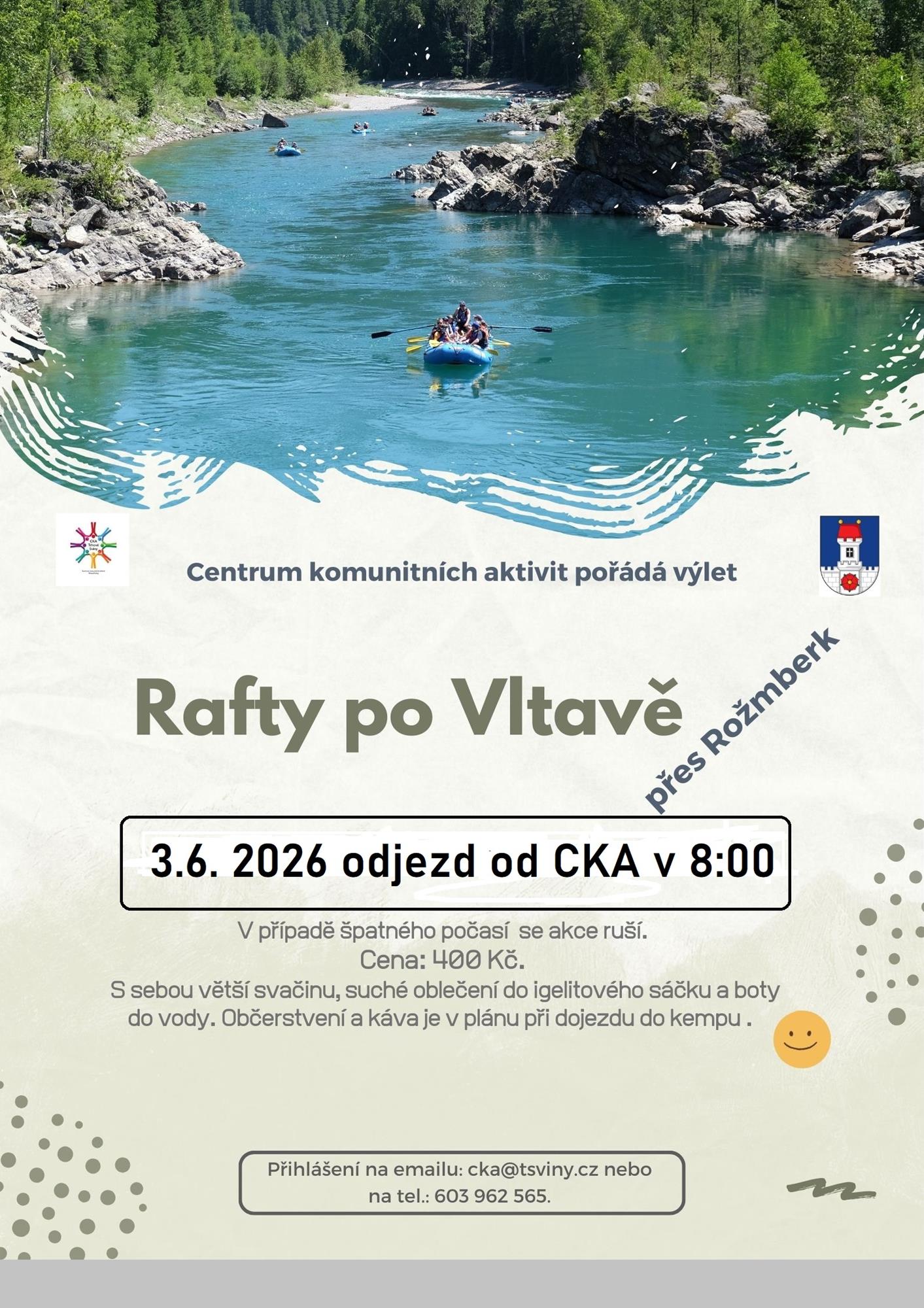 - 3. 6. Rafty na Vltavě: Sraz: v 8:00 u CKA TS Cena: 400 Kč. S sebou: větší svačinu, suché oblečení (v igelitovém sáčku), boty do vody. Upozornění: V případě špatného počasí se akce ruší.