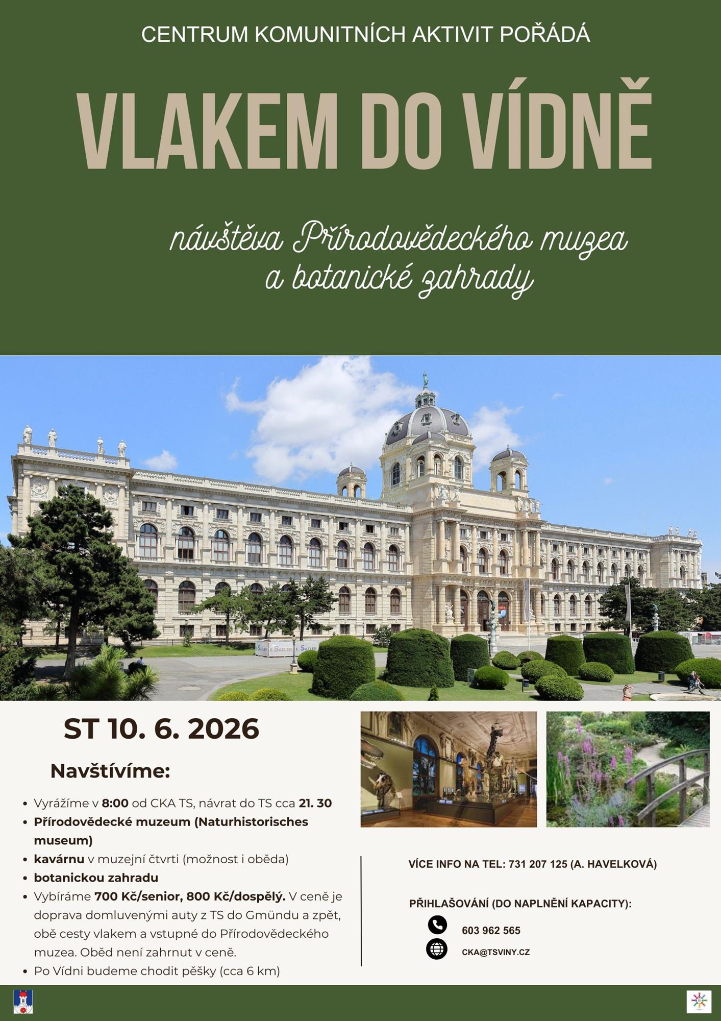 - 10. 6. Výlet vlakem do Vídně: Sraz: v 8:00 u CKA TS, návrat cca 21:30. Program: Přírodovědecké muzeum, muzejní čtvrť (kavárna/oběd), botanická zahrada. Po Vídni pěšky cca 6 km.