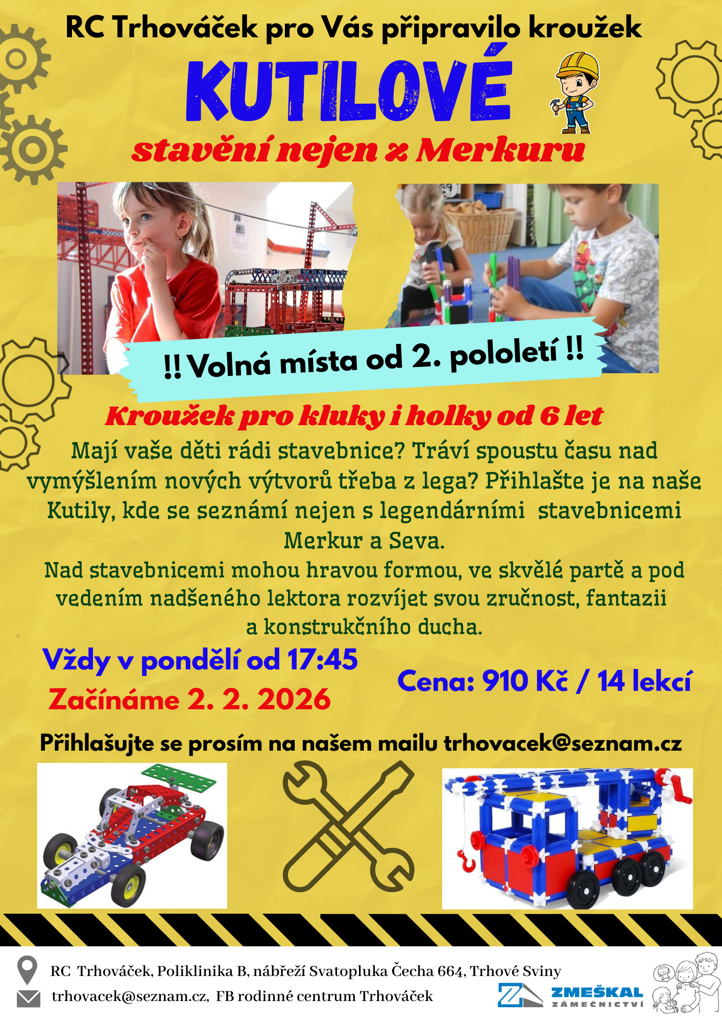 Na závěr pro vás máme ještě dvě pozvánky. Od druhého pololetí se nám uvolnila nějaká místečka na kroužku kutilové. Pokud máte doma malého konstruktéra a nadšence do stavebnic, ale už vám docházejí nápady, či materiál, nebo byste rádi své dítko dostali na chvíli pryč od obrazovek, přijďte vyzkoušet kutily. Kroužek probíhá každé pondělí od 17:45 a pro děti od cca 6 let jsou zde k dispozici legendární stavebnice Merkur a Seva a nově i elektronická a magnetická stavebnice. Stavebnice jsme mohli zakoupit díky štědrému daru firmy Zámečnictví Zmeškal a děti tak opravdu mají z čeho vybírat.