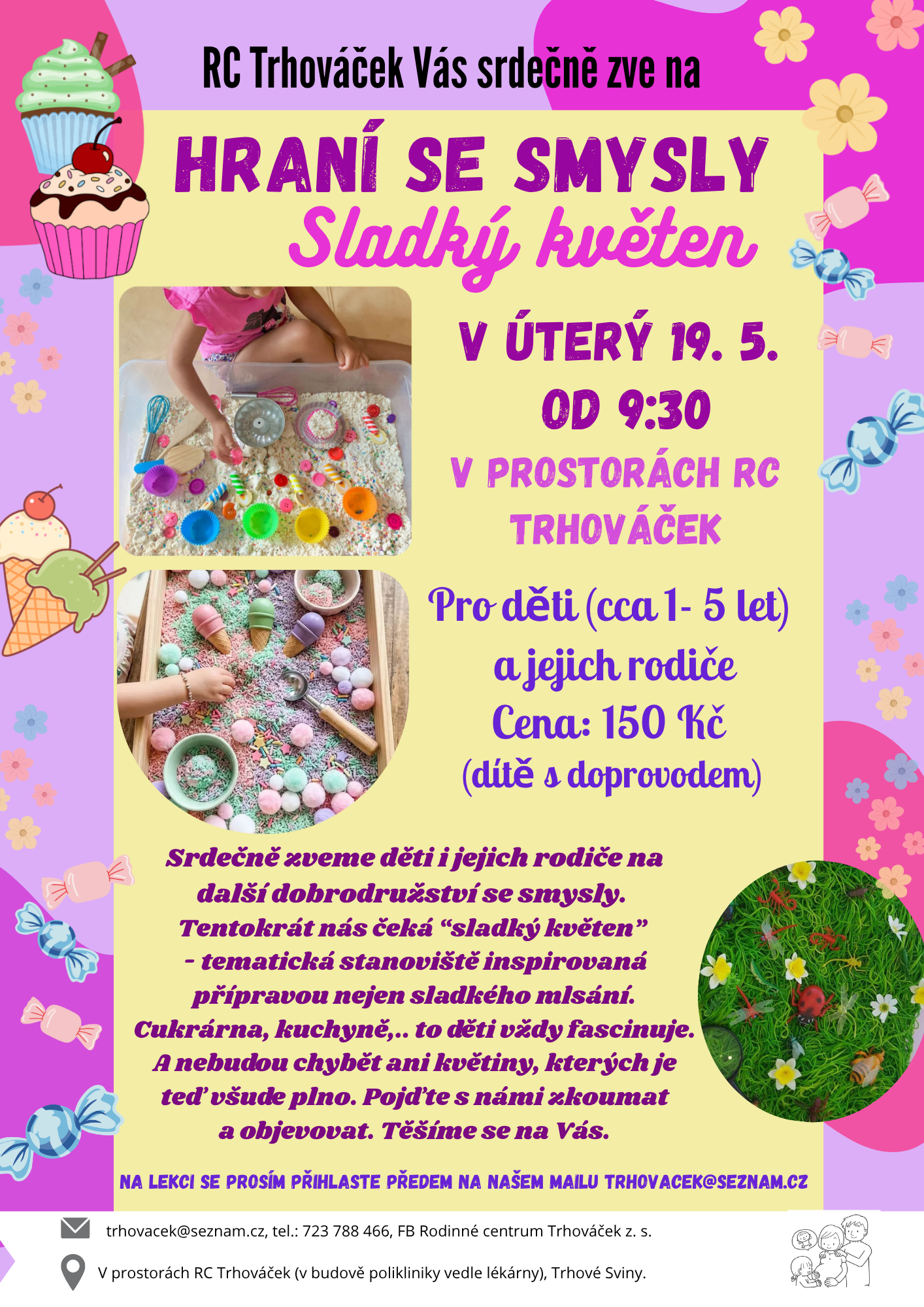 A co že nás ještě v květnu čeká? V pondělí 18. 5. dopoledne si zacvičíme s fyzioterapeutkou Mgr. Editou Pokornou. Setknání pro miminka do jednoho roku probíhá od 8:30 a pro větší děti do tří let od 9:30. Opět se také můžete těšit na hraní se smysly, které bude inspirováno dětským nadšením z cukrovinek a obdivem ke všemu, co dělá maminka. Sladké květnové dobrodružství se smysly se bude konat v úterý 19. května od 9:30 a pozve vás do kuchyně, do cukrárny i na louku mezi květiny. Moc se těšíme na všechny malé objevitele i jejich rodiče.