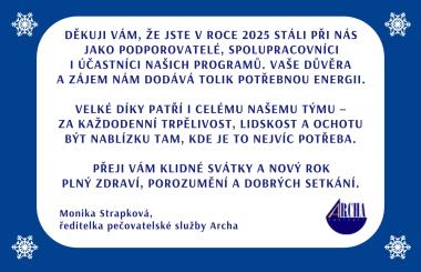 Ať už jsou vaše svátky klidné nebo plné ruchu, přejeme vám, abyste je prožili v blízkosti těch, kteří vám rozumějí. A pokud potřebujete pomoc, vězte, že Archa je tu pro vás – nejen o Vánocích, ale po celý rok.