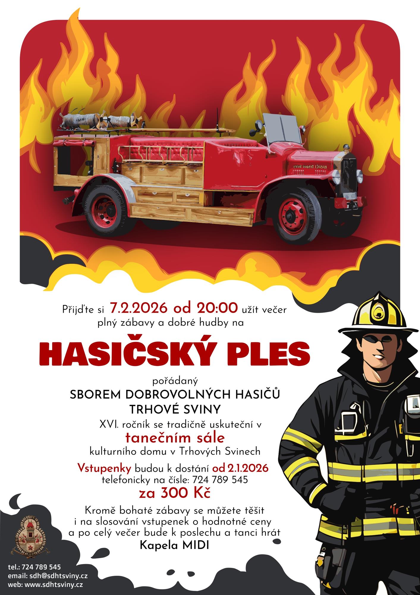 Jiná PořadatelSDH Tthové Sviny Popis XVI. ples SDH tradičně v tanečním sále KD T. Sviny. Vstupenky od 2.1.2026 telefonicky na 724 789 545.