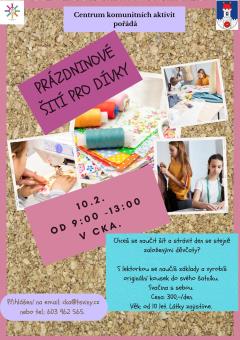Vzdělávání PořadatelCentrum komunitních aktivit Popis Pro dívky od 10 let je připraveno celodenní prázdninové šití v úterý 10. 2. od 9:00.