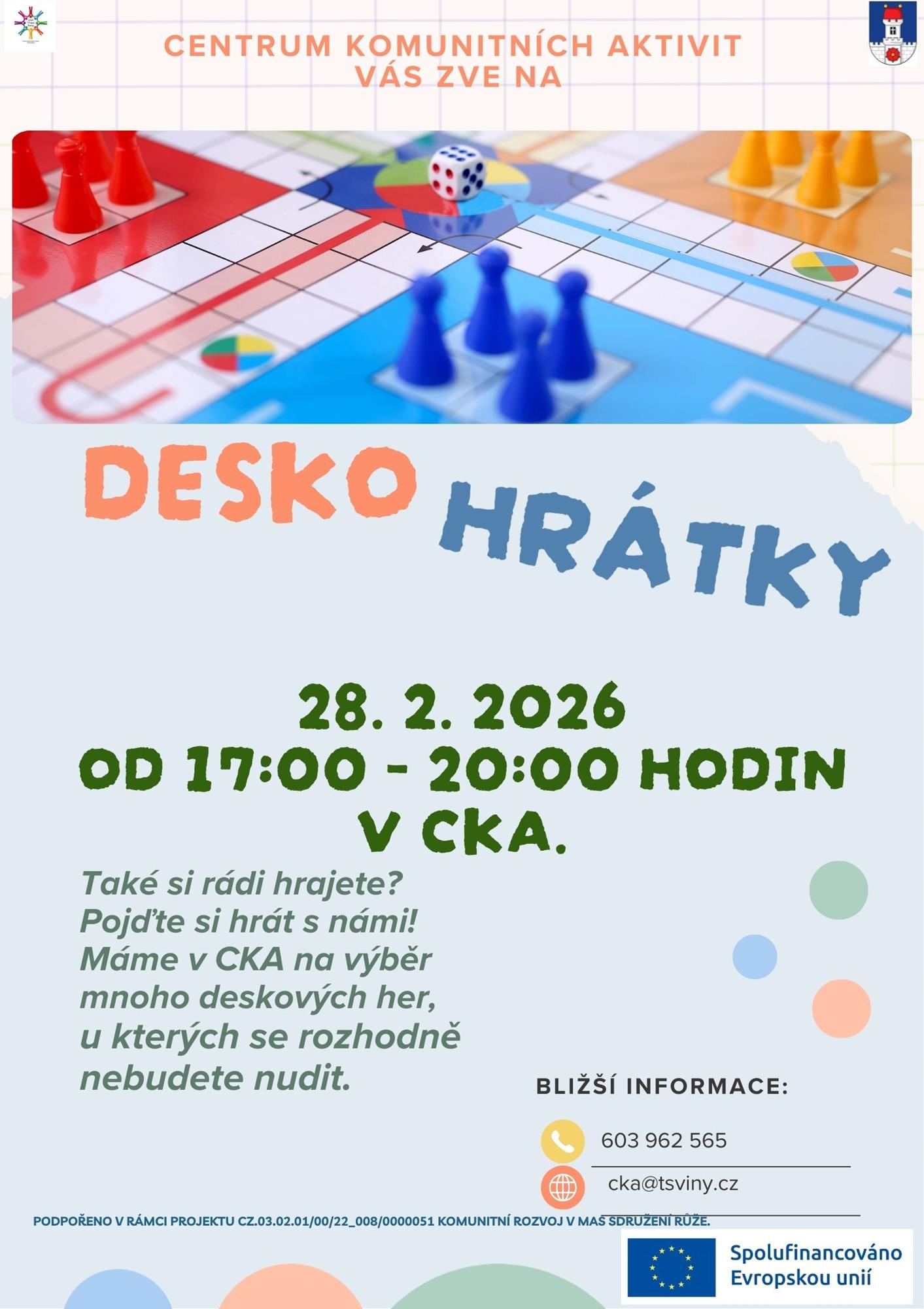 Hobby PořadatelCentrum komunitních aktivit Popis • Deskohrátky – 28. 2. 2026 od 17:00 nás čeká spousta zábavy u deskových her. Tentokrát se nesejdeme v sobotu dopoledne, ale až v podvečerních hodinách.