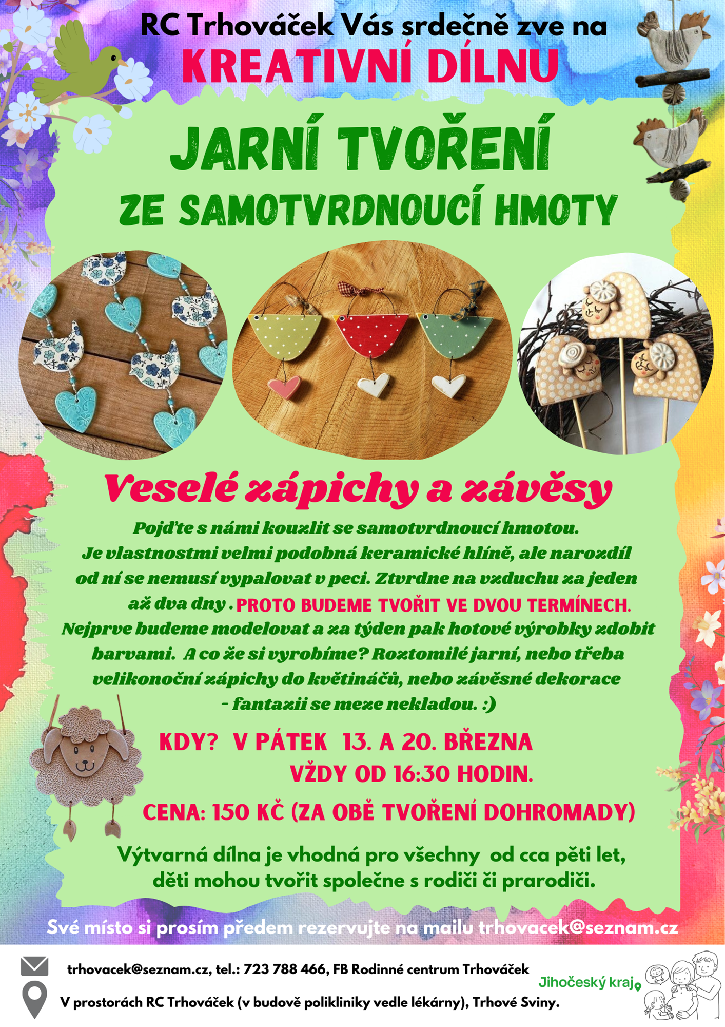 Hobby PořadatelRC Trhováček Popis Tato kreativní dílna bude probíhat ve dvou termínech - 13. března budeme modelovat ze samotvrdnoucí hmoty a 20. března budeme budeme vytvrdnuté výrobky dotvářet a zdobit. Na všechny se těšíme.