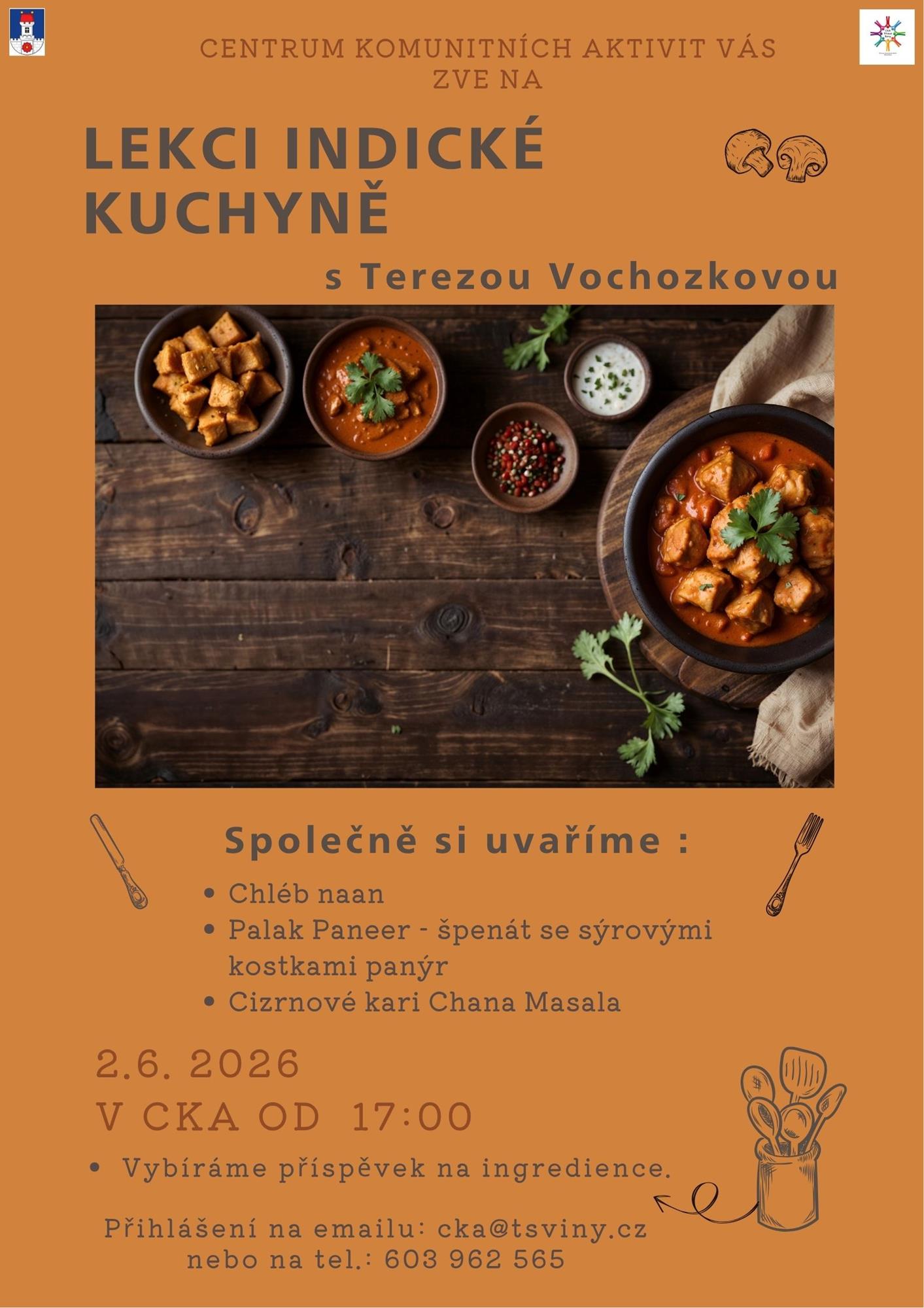 Centrum komunitních aktivit Vás zve na lekci indické kuchyně s Terezou Vochozkovou. Společně si uvaříme : Chléb naan, Palak Paneer - špenát se sýrovými kostkami panýr, cizrnové kari Chana Masala. Vybíráme příspěvek na ingredience. Přihlásit se můžete na emailu: cka@tsviny.cz nebo na tel.: 603 962 565.